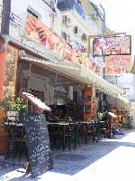 Este kifogtuk a város legrosszabb gyrososát: senkinek sem ajánlom a sétány végénél balra emelkedő utca (nem kell jobbra tartani a kikötő felé, és a buckákkal autók elől lezárt utcán sem folytatni utunkat!) Wellcome Snack Bar névre keresztelt, elvileg N°1 görög specialitásokat áruló helyét – igen, ez az, ami a gyógyszertár mellett van 3-4 lépésre. Most is beleborzongok, mennyire szörnyű volt: a pita teljesen száraz, a paradicsom a hőségtől összeaszalódva, a hús rágós és íztelen… Tényleg nem olyan, mint amit mi megszoktunk!