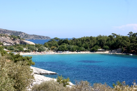 Szinte érezni a tenger hullámzását még most is, ahogy rágondolok, itt hallom a fülemben a zúgást, imádom. Halászhajók és bbq-party-ladikok jöttek-mentek, szemben a párába veszve pedig Szamothraki szigete. Félig-meddig titkon, de oda vágyom, sajnos a költségvetésünkbe nem fért volna bele, pedig ahogy utánajártam, álomészép sziget. Mondjuk nem hallottam még ronda görög szigetről, na de akkoris. :D Sok gyerekes család volt a parton, kis totyogóssal is jöttek, a jövő nyári úton talán már Milán is így seder a homokban, mint az a hurkalábú görög kisfiú. :) Jó három órát sikerült semmittennünk, napfürdőznünk, és úszkálnunk a finom, sós vízben, mikor feltámadt a szél. Tengerészünk persze azonnal reklamált, nem volt neki jó sehogy, ezért útnak indultunk, valahova tovább, dél felé. Szebbnél szebb öblök ezüst, mélykék és türkiz színben váltották egymást.