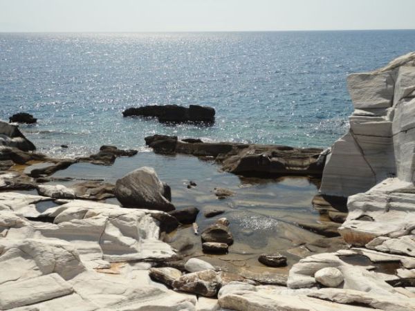 Amerre köveket láttam, arra mentünk, ez volt az irányadó. :) Plusz ugye tudtam, hogy itt van valahol az ókori márványbánya, de akkor még fogalmam sem volt, hogy merre, úgy véltem, hogy nem akkora nagy a sziget, egyszer úgyis rábukkanunk. A romok után jött a fehér sziklákkal övezett tengeri kilátás, és én hegyen-völgyön át másztam rá a hatalmas sziklákra, hogy minél jobban ki tudjak menni a tenger partjához (még jó, hogy vittem úszócipőt, mert rájöttem, hogy mivel ennek a talpa nem csúszik, ezért tökéletes a kövek megmászásához), a párom meg egyfolytában azon aggódott, hogy mikor fogok lezuhanni, vagy megcsúszni valahonnan.