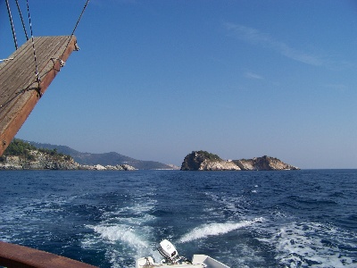 Megálltunk egy szigetnél, kiosztották a horgászfelszerelést, hogy próbáljunk halat fogni. Természetesen senkinek sem sikerült. Az Ági alámerült és egy nagy zsák kincset hozott fel. Pános, a férje segített neki felnyitni, s ő egy nagyon érdekes ismertetőt tartott a tenger élőlényeiről, sünökről, osztrigákról, kagylókról. Elmondta, mi ehető, illetve mikor ehető és mikor nem, kóstoló is volt, sokan éltek a lehetőséggel és megkóstolták. A következő öbölben kikötöttünk, lehetőség volt fürdésre, amíg elkészült az ebéd. Nyárson sült hús volt, grillen sült húspogácsa, tzatzikival és savanyúsággal, mire végeztünk, átértünk a Nagy Márványpartra.