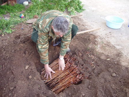 A kötegeket fejjel lefelé, kiásott gödörbe helyezik.